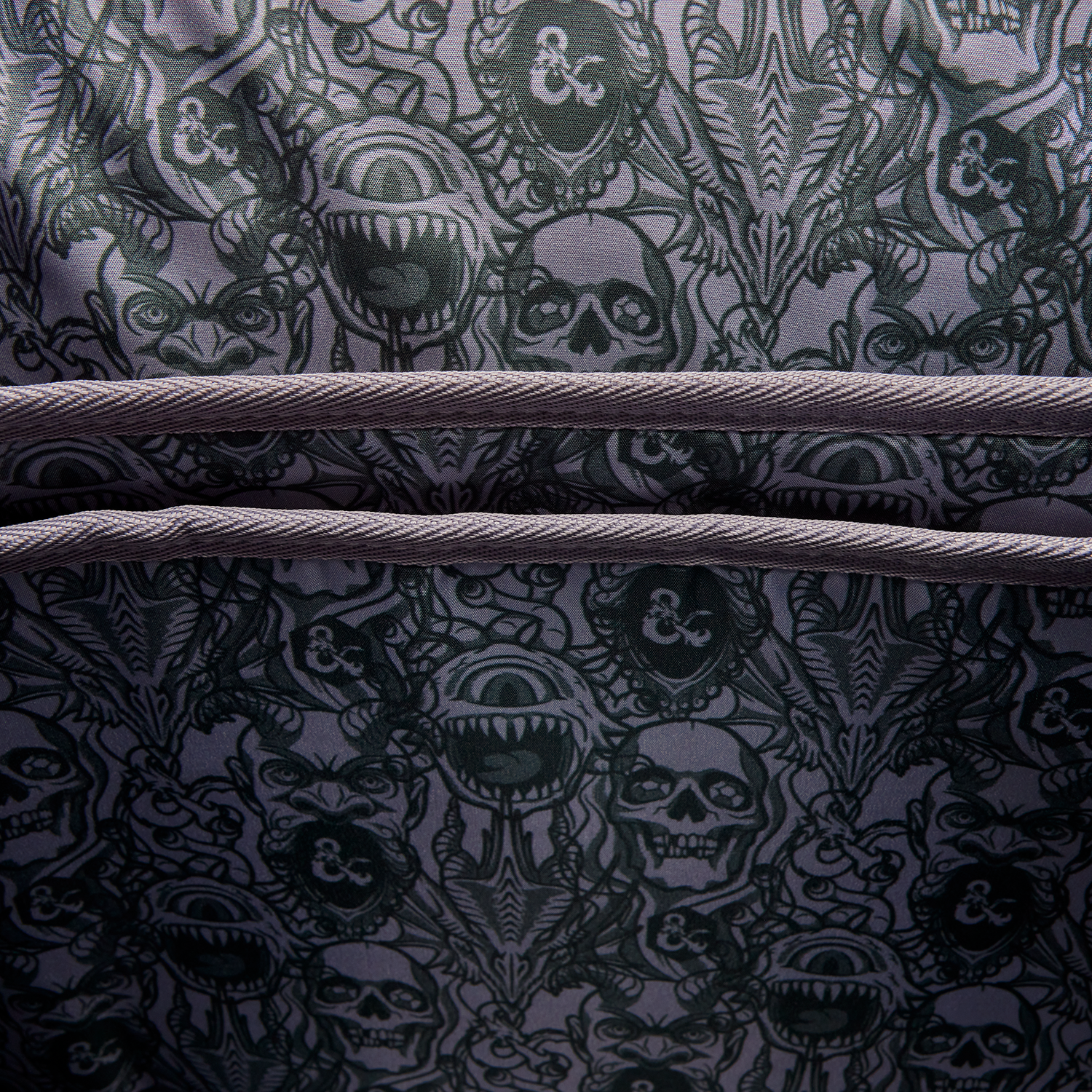 You don’t need to roll a Nat 20 to excel in style with this bag! This full-size bag is perfect for any Dungeons & Dragons fan. You’ll find a ton of gear for your next session built into this bag. Velcro straps with buckles can hold a map. A foldable dice tray is attached to the bag. Plus, you’ll find a detachable drawstring bag to hold your dice! You’ll find fun details like a molded metal rivet of the D&D logo, and D20s on the buckles. Turn it around to find embroidered shapes of each of the dice along the straps.