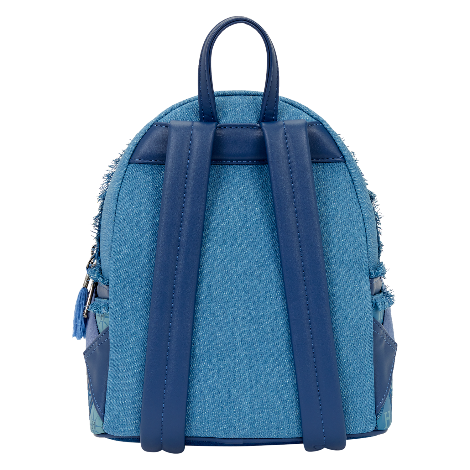 This mini backpack features faux denim, metal charms, and fringe. On the front pocket, you’ll find the Hogwarts crest with symbols of each house. The bottom of the front pocket and side pockets feature an all-blue argyle-type pattern, which includes the Hogwarts “H” symbol. Turn it around to find “Harry Potter” debossed on one of the straps.