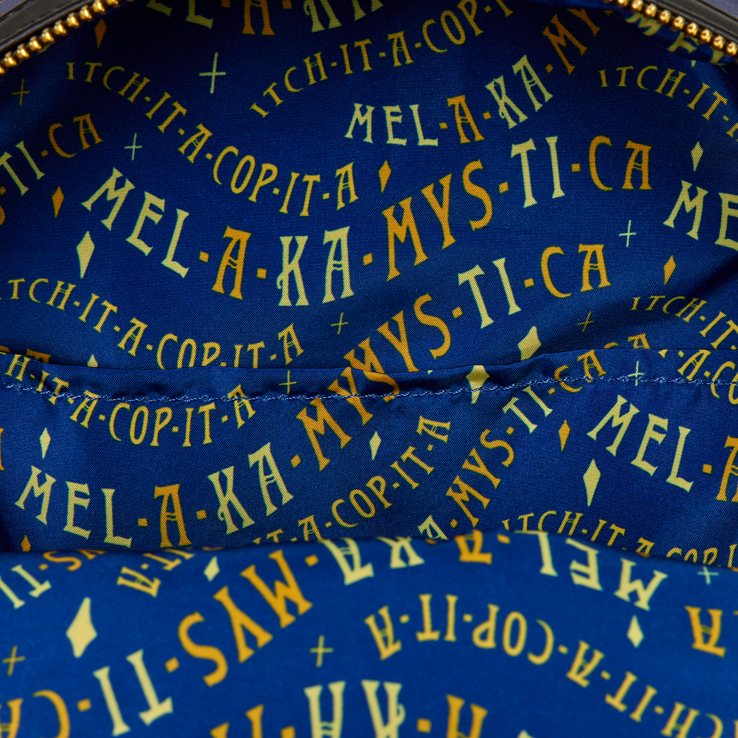 This mini backpack features the Sanderson sisters from Disney’s Hocus Pocus. They dance together under a starry sky in a graveyard. Binx pops up from behind a headstone! On the side pockets, you’ll find gold foil details of each of their brooms.