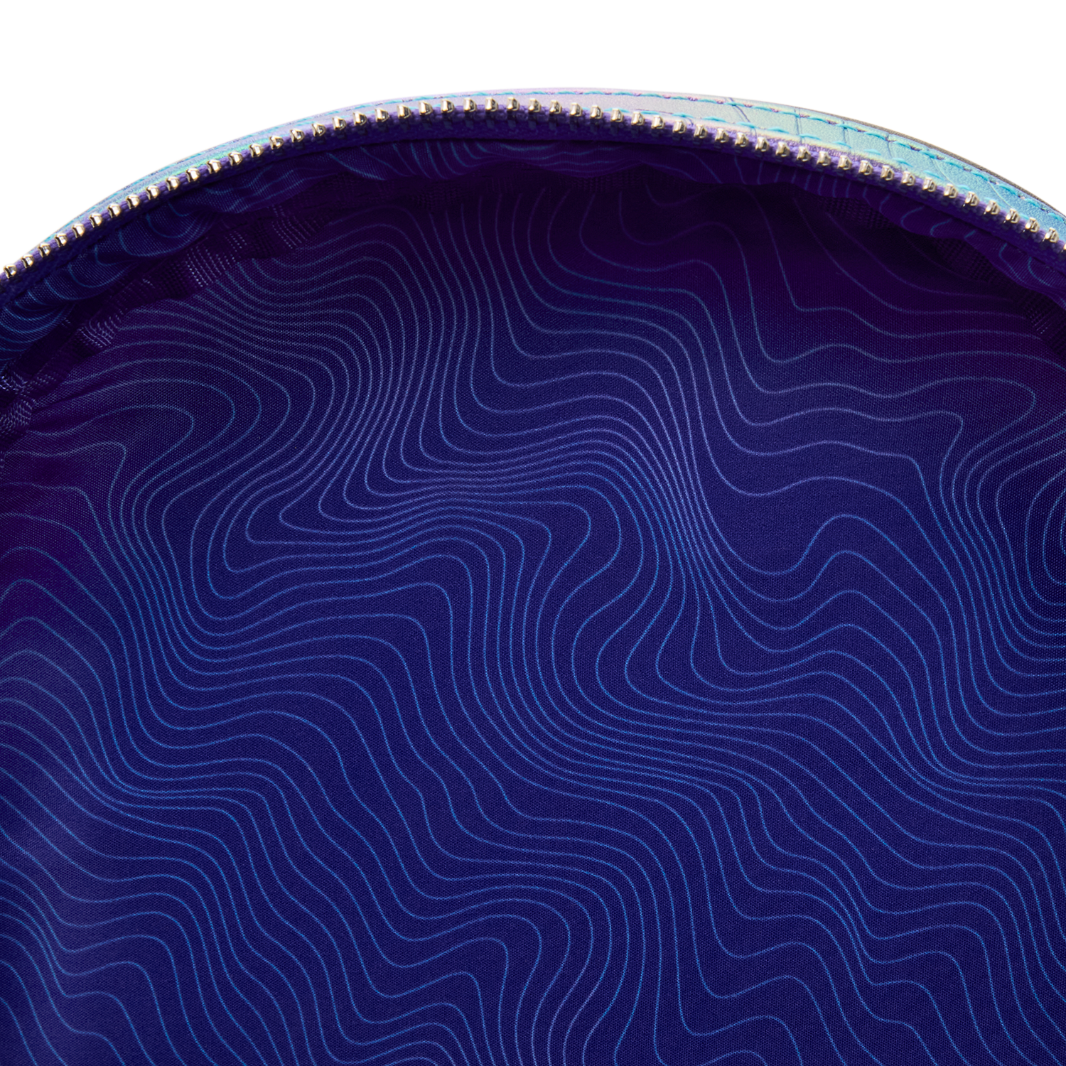 On this bag, you’ll find iridescent appliques of Rumi, Mira, and Zoey. Purple highlights the side pockets, zipper, and straps. Star appliques are also on the straps. Attached to the bag is a photo card bag charm with three cards, one for Rumi, one for Mira, and one for Zoey. There’s also a beaded charm attached with charms of a heart, bell, and turtle.