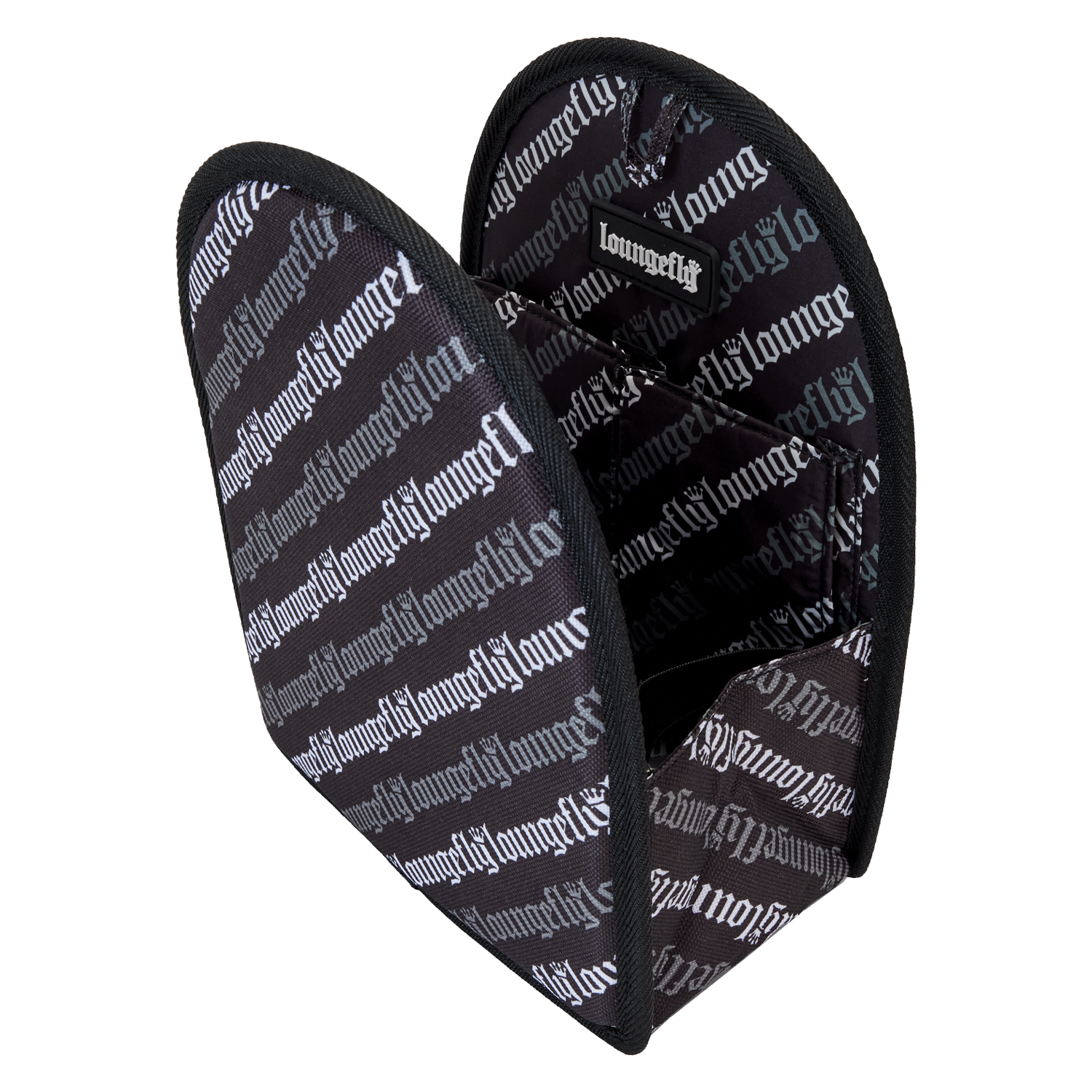 The Loungefly Mini Backpack Insert Organizer is made of nylon and features collapsible patch pockets, drop pockets, utility loops, lobster clips, D-rings, and printed details.