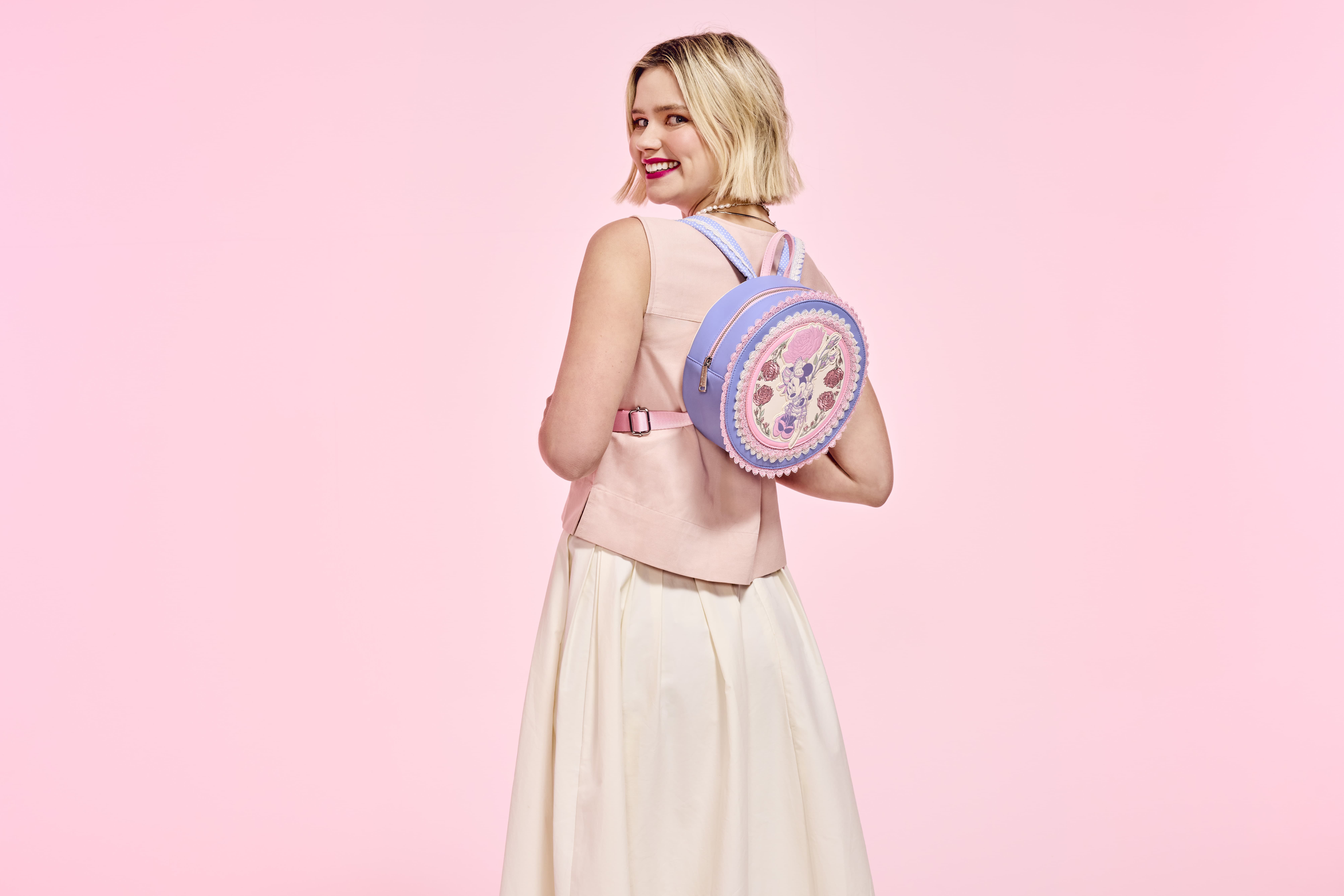 Fashion is in full bloom with this Disney’s Minnie Mouse mini backpack. Minnie flourishes in style on the front of this circular-shaped accessory. She appears as an applique, all dressed up and holding a small bouquet of flowers. Embroidered roses surround her, and vintage lace details in pink and white make concentric circles to frame the scene. Pack your daily essentials, take off on an adventure, and watch the fun blossom.