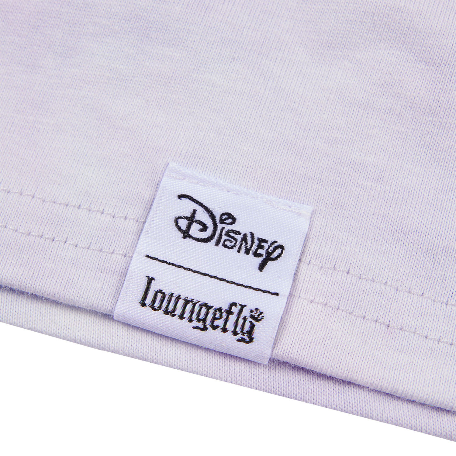 This tee is 100% cotton jersey with a pastel mineral wash. It’s purple with puff print symbols on the front, like a wishing well, an apple, and some woodland creatures. Underneath, you’ll find the words, “SNOW WHITE, EST. 1937.” On the back is an illustration of her castle!