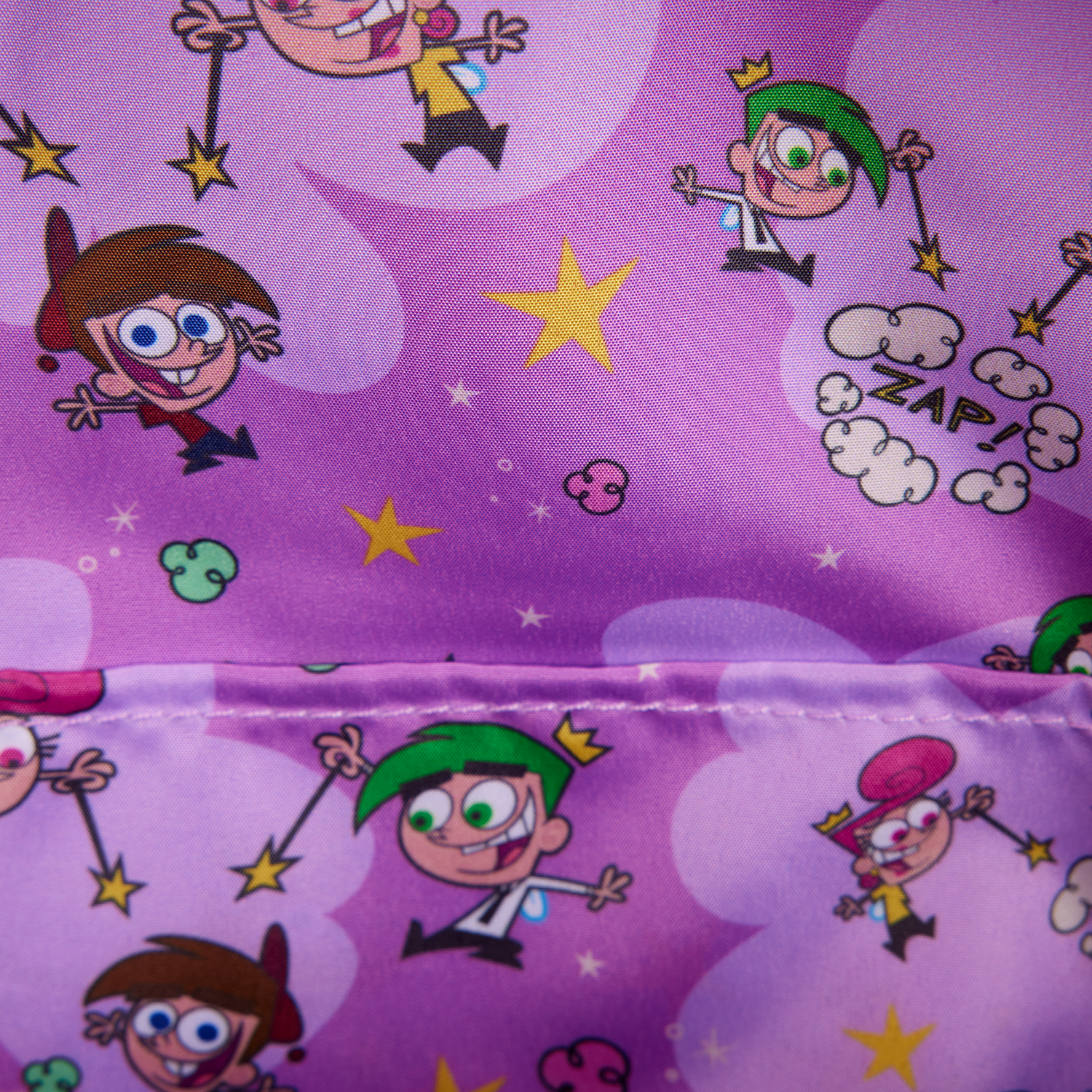 This mini backpack features three pockets – one features Wanda, one features Cosmo, and one features Timmy! Behind them is an illustration of Timmy’s house and front yard, featuring Vicky! The side pockets and straps feature Cosmo and Wanda in different forms, like a cloud and sun, and mirror and hairbrush! Plus, for an extra cool detail, the stars on their wands glow in the dark!